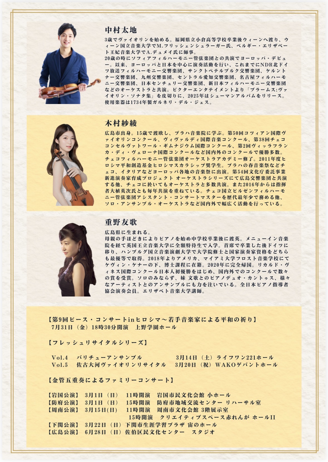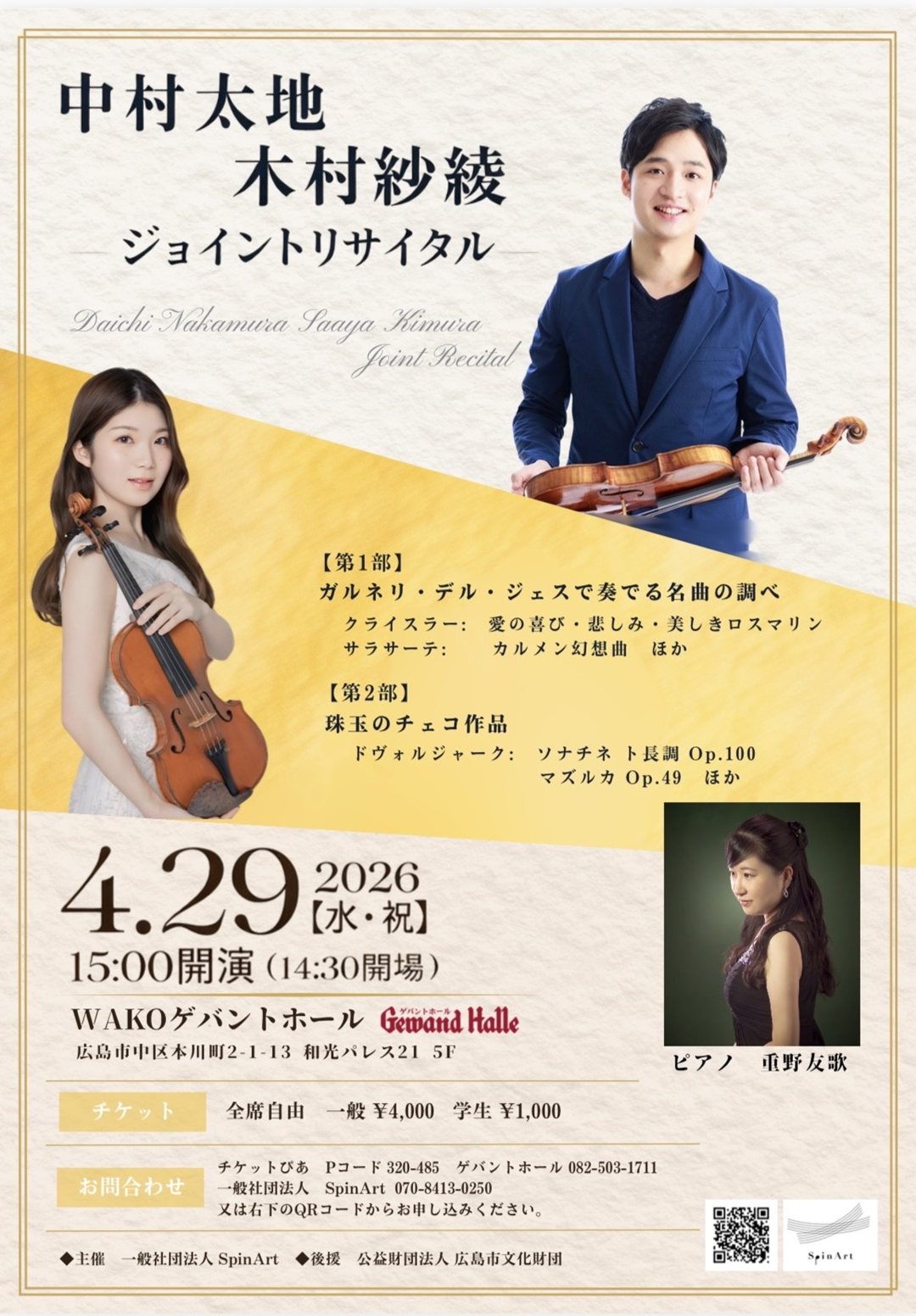 中村太地 木村紗綾 ジョイントリサイタル 開催日:2026年4月29日(水)開 場:14:30 開 演:15:00 入場料:全席自由 一般4,000円 学生1,000円 連絡先:一般社団法人 SpinArt:070-8413-0250 名器ガルネリ・デル・ジェスで奏でる珠玉の調べ。至高のアンサンブルをお届けします。