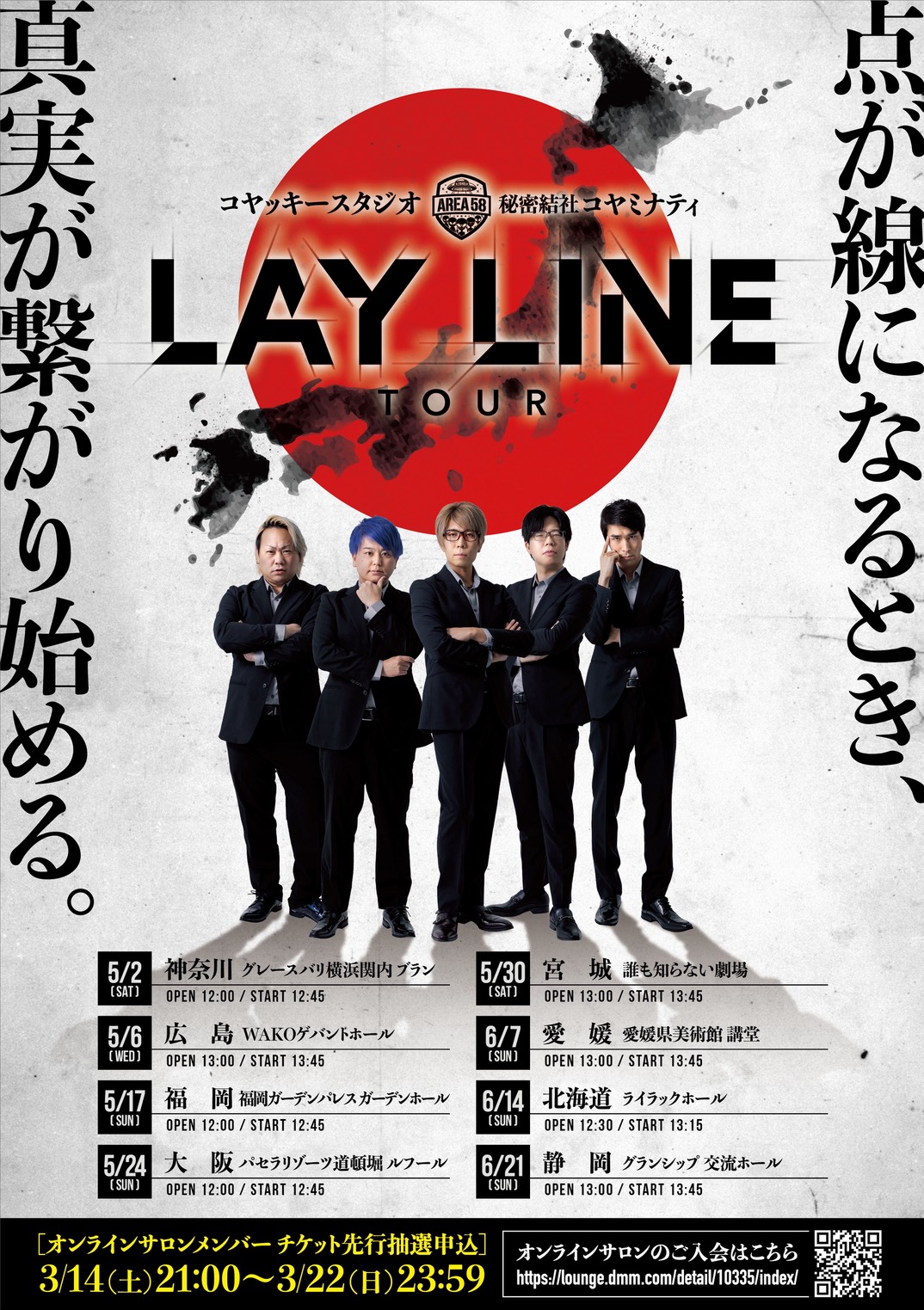 コヤッキースタジオ × 秘密結社コヤミナティ LAY LINE TOUR 広島公演 開催日:2026年5月6日(水)開 場:13:00 開 演:13:45 『点が線になるとき、真実が繋がり始める。』ここでしか聞けない衝撃のストーリー。あなたの知る現実が覆る、特別なステージをお見逃しなく!