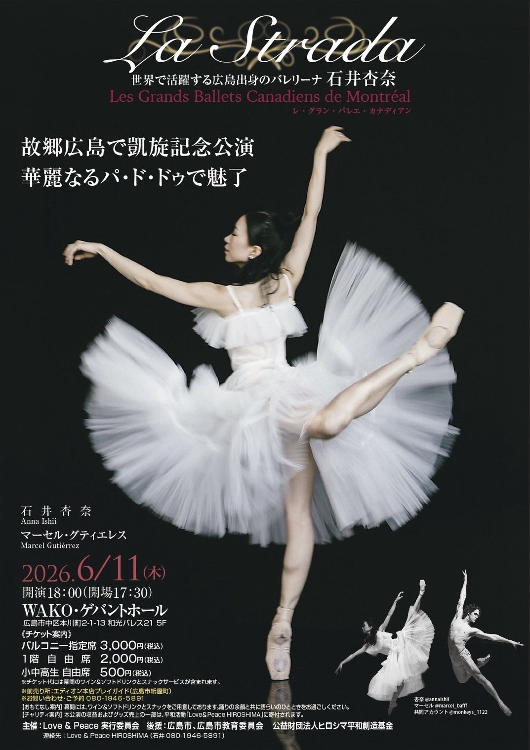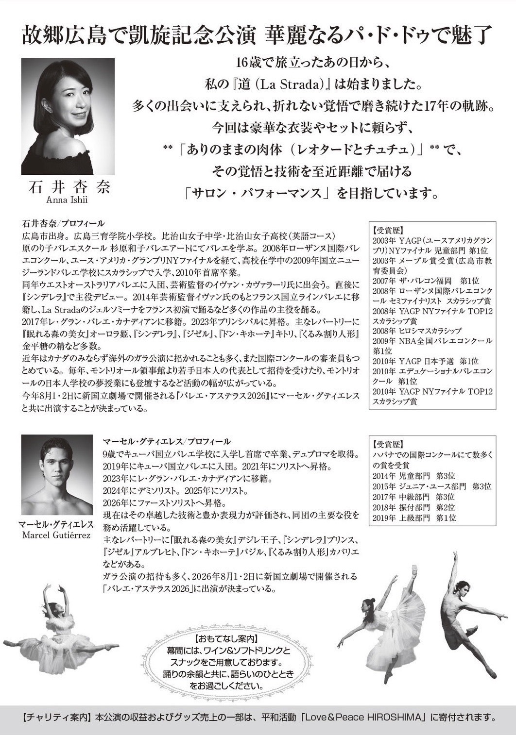 世界を舞台に活躍する石井杏奈氏の故郷・広島での凱旋記念公演にて、華麗なるパ・ド・ドゥをぜひご堪能ください。
